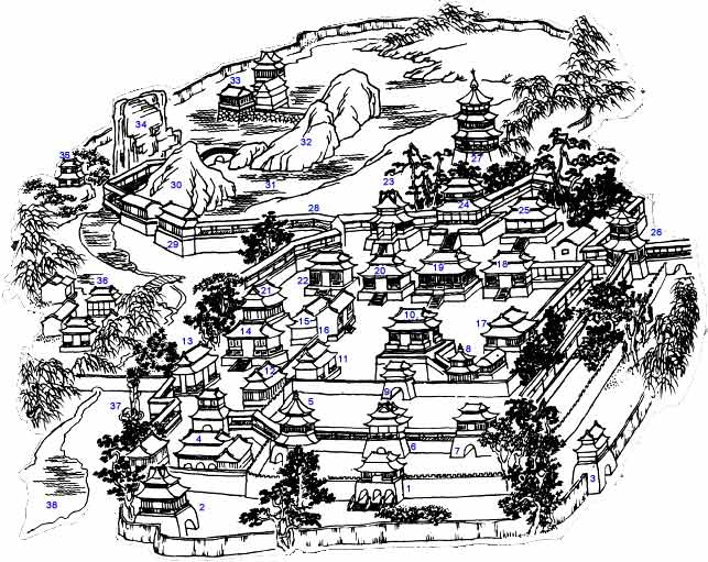10、玉堂 11、奇宝宫 12、铜柱殿 13、疏囿殿 14、神明堂 15、鸣銮殿 16、承华殿