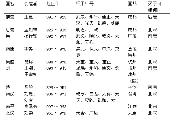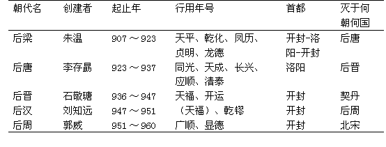 现了五个朝代和割据西蜀、江南、岭南和河东的十个政权,合称五代十国。 五代是后梁、后唐、后晋、后汉、后周。除后梁一个短暂时期以及后唐都洛阳外,后梁大部分时期和其他三代都以开封为首都。五代为期五十四年,有八姓称帝(后梁、后晋、后汉各一姓,后唐三姓,后周二姓),共十四君。后梁和后周的君主是汉族人,后唐、后晋、后汉的君主是沙陀族人。他们都建国于华北地区,疆土则后梁最小,后唐最大。 十国是前蜀、后蜀、吴、南唐、吴越、闽、楚、南汉、南平(荆南)和北汉,北汉建国于今山西境内,其余九国都在南方,十国与五代并存,但各国存在时间长短不一,如吴越,割据于唐亡以前,直到五代结束后才为北宋所灭。疆土则南平最小,南唐最大。 五代的更迭和十国的割据 五代的更迭 自唐中和四年(884)黄巢起义失败以后,唐朝名义上还存在二十余年。但早被削弱了的朝廷威权这时更加衰微,新旧藩镇林立,战争不休。国家分裂的倾向日益明显。那时,罗绍威据魏博(今河北大名北),王镕据镇冀(今河北正定),刘仁恭据卢龙(今北京),诸葛爽据河阳(今河南孟县东南)和洛阳,孟方立据邢(今河北邢台)、洺(今河北邯郸东北),李克用据太原、上党(今山西长治),朱温据汴(今河南开封)、滑(今河南滑县东),秦宗权据许(今河南许昌)、蔡(今河南汝南),时溥据徐(今属江苏)、泗(今江苏盱眙北),朱瑄据郓(今山东东平北)、曹(今山东定陶西)、齐(今山东济南)、濮(今山东鄄城北),王敬武据淄(今山东淄博南)、青(今山东益都),李茂贞据凤翔(今属陕西),高骈、杨行密先后据淮南,秦彦据宣(今安徽宣城)、歙(今安徽歙县),刘汉宏、董昌据浙东,钱镠据浙西(后又并浙东),王建据两川,王潮、王审知兄弟据福建,马殷据湖南,刘隐、刘岩兄弟据岭南。他们都力图扩大实力。经过多年的相互兼并,逐渐形成了几支较大的势力。在北方,主要是以汴州为据点的朱温和以太原为中心的李克用。天祐四年(907),朱温灭唐称帝,是为后梁太祖,国号梁,史称后梁,改元开平。五代时期自此正式开始。 朱温本是黄巢起义军的叛徒,受唐封为宣武节度使,据汴州。此后,他逐渐攻占了蔡、徐、郓、曹、齐、濮等州,扫除了今华北的许多武装割据势力。天复三年(903),又战败称霸秦陇、挟持唐昭宗的李茂贞,消灭了长期掌握朝廷军政大权的宦官集团。中唐以来的强藩魏博、成德也因战败归附朱温。后梁建国以后,除今山西大部和河北北部外,基本统一了黄河中下游地区。乾化二年(912),朱温为其次子朱友珪所杀。次年,第三子朱友贞平乱后,即帝位。此后,后梁连年用兵,征敛苛重。贞明六年(920),陈州人毋乙、董乙领导农民起义,势力扩及陈(今河南淮阳)、颍(今安徽阜阳)、蔡三州,后虽被镇压,后梁也开始衰败。