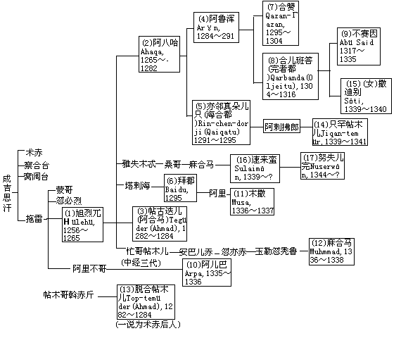 阿八哈汗及其子阿鲁浑 1265年旭烈兀卒,诸王、大臣奉阿八哈嗣位。阿八哈以未得大汗许可,只权摄国政,同时遣使报丧,于是忽必烈派使者持诏立他为汗。现存1279年阿八哈颁发的一张敕令上,盖有汉字“辅国安民之宝”方印,当是忽必烈颁赐给他的王印。阿八哈即位后,始定都于桃里寺(今伊朗阿塞拜疆大不里士),以蔑剌哈为陪都。忽必烈大举攻宋,征工匠于阿八哈,回回炮手阿老瓦丁、亦思马因等入京应命,回回炮技术因而传入中国。1282年阿八哈卒,弟帖古迭儿(又名阿合马)继立。1284年,阿八哈子阿鲁浑声言其父尝受大汗册命,汗位应当属己,于是在权臣不花支持下起兵推翻其叔,并遣使入元奏报。忽必烈命他继承汗位,并授不花为丞相。在此之前,忽必烈遣孛罗丞相等出使伊利汗国,1284年到达。孛罗在元朝历任要职,学识丰富,阿鲁浑将他留在汗廷参议政事。阿八哈、阿鲁浑父子为夺取叙利亚之地,采取与欧洲基督教国家结盟的政策,和拜占廷帝国结亲,并遣使赴罗马教廷及英、法等国,建立了友好关系。1291年阿鲁浑卒,弟海合都(又名亦邻真朵儿只)继立。海合都挥霍无度,国库空虚,于是仿效元朝钞法,在孛罗丞相指导下印造发行交钞(见钞),但行用未久即废。1295年,权臣谋杀海合都,奉诸王拜都为汗,阿鲁浑子合赞起兵讨灭叛者,夺取汗位。合赞为取得当地封建主和穆斯林的支持,改信伊斯兰教,并定为国教。他的即位和改变宗教信仰,都得到元成宗铁穆耳的承认。1298年,合赞遣使入朝,贡珠宝等物。蒙哥时,曾以彰德路为旭烈兀分地,这时,成宗即将旭烈兀分地历年应得岁赋赐合赞。现存1302年合赞致法国国王信上,钤用汉字“王府定国理民之宝”方印,当是元朝新颁给伊利汗的王印。合赞即位后,大力进行社会改革,制定新的土地、赋税、驿站、货币等制度,限制蒙古贵族、将校和官吏对人民的横征暴敛,使农业、工商业得到发展,财政收入增加。他还鼓励发展科学文化,在首都兴建天文台,设立学校,命宰相拉施都丁编纂《史集》。合赞通晓多种语言,对天文、医学和许多工艺都颇有知识,尤精通历史,被誉为贤君。他与密昔儿的马木路克王朝为争夺叙利亚多次发生战争,察合台汗国的笃哇汗乘机攻占伊利汗国东部的吐火罗(今阿富汗东北部)之地。1304年合赞卒,弟合儿班答继立,号完者都汗,迁都于新建的孙丹尼牙(今伊朗阿塞拜疆苏丹尼耶)。合儿班答遵循其兄政策,仍用拉施都丁为宰相,继续发展经济、文化。拉施都丁除完成《史集》巨著外,还编纂了一部《伊利汗的中国科学宝藏》,介绍中国历代的医学成就。这时,元成宗与笃哇、察八儿达成和议,蒙古皇室的内争暂停,东西驿路畅通,伊利汗国和元朝的使节往来更加频繁。1305年,合儿班答致信法国国王腓力四世宣告此事,信上钤用汉字“真命皇帝和顺万夷之宝”方印。1316年合儿班答卒,子不赛因嗣位,还都桃里寺。权臣出班有拥立之功,不赛因为他向元朝请封,1324年泰定帝授出班“开府仪同三司、翊国公”,赐银印、金符。出班专擅国政,诸子皆居要职,与不赛因发生矛盾。不赛因杀其第三子,出班举兵叛,兵败被杀。经过这次内乱,国势削弱,统治集团的内部矛盾和国内民族矛盾、阶级矛盾同时迸发。 伊利汗国汗系表