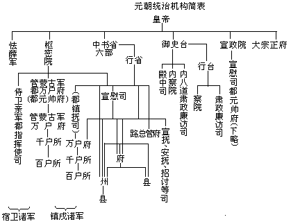 达鲁花赤铜印 祖忽必烈曾于至元三年(1266)设制国用使司,总理全国财政,以后一度成为与省、台、院并立的最重要的国务机构之一。七年,罢制国用使司,立尚书省,统六部,并改天下行中书省为行尚书省。中书省建置虽仍被保留,但实际上已改由尚书省总领国政。九年,罢尚书省,以其职权归并中书省。至元后期和武宗至大年间,元廷又两次立尚书省,分别历时五年、三年,以“理财”为施政中心。主持全国释教及吐蕃地区军、民之政的宣政院,由于职掌的特殊性,自成系统。蒙古国初期,即置札鲁忽赤治天下刑政。随着元朝国家机器的完备,设大宗正府为札鲁忽赤官署,主要治理诸王、驸马、投下蒙古、色目人的刑名等公事,时而兼管汉人刑狱。在宗教、文化方面,元代比较独特的中央机构还有管理也里可温的崇福司、掌回回历法的回回司天监、蒙古翰林院及其所属蒙古国子监等。 地方最高行政机构,在忽必烈即位之初,为十路宣抚司;同时,他又委派重臣以都省官“行某处省事”系衔,到各地署事,行使中书省职权,简称行省。至元后期,行省官员不复以中书省官系衔,行省逐渐由临时性的中央派出机构定型为常设的地方最高行政机构。除“腹里”(河北、山东、山西)直隶于中书省,吐蕃由宣政院辖理以外,所置有岭北、辽阳、河南、陕西、四川、云南、甘肃、江浙、江西、湖广等行省。在距离省治较偏远的地区,分道设宣慰司,就便处理军民事务,“与职民者,省治之;职军者,院临之”。边陲民族地区的宣慰司、宣慰司都元帅府及其所统路府州县或宣抚、安抚、招讨等司,多参用当地土官任职。御史台在地方上也有相应的分设机构,即监临东南诸省的江南诸道行御史台(简称南台)和陕、甘、滇、蜀地区的陕西诸道行御史台(简称西台)。中台和两个行台下各设若干道肃政廉访司(元初称提刑按察司),定期检查各种案卷帐目,监督纠劾各级官吏,复按已审案件。御史台(或行台)与诸道肃政廉访司相衔接,构织成全国范围的垂直监察系统。为了征伐或镇抚的需要,枢密院有时也在有关地区设置行枢密院(简称行院)。行省以下的行政机构,分别为路、府、州、县。诸王、勋戚在内地各行省的封地上仍保留相当的特权,但这些封地在行政建置方面同样被纳入郡县制体系。路治所在城镇,并没有一个或几个录事司,管理城区居民。 元政府在许多中央机构、行省以下的大部分地方行政机构和许多管军机构中都设立达鲁花赤一职,一般由蒙古人或色目人担任,以此保障蒙古贵族对全国行政、军事系统实行严密监控和最后裁决的权力。路、府、州除蒙古人任达鲁花赤,又以汉人为总管、知府(或府尹)、知州(或州尹),以色目人为同知,使他们互相牵制,以利于民族防范和阶级统治。元代主要行政、军事统治机构的领属系统如下页表所示。 军事制度 元代在漠北草原的蒙古人,仍过着兵民合一的游牧生活,战时出军,平时便屯聚牧养。在汉地和江南,元朝军士的来源采取从固定的军户中签发的办法。蒙哥二年壬子(1252)大规模籍户时,已明确地区分民户和军户。进入内地的大多数蒙古人户及被收编的金、宋降军之家,皆以军户著籍;此外还有一些汉族或其他各族人户陆续被新签为军户,一般都由中户充当。军户种田,可免税粮四顷,称为“赡军地”。蒙古、探马赤军和汉军(金朝降军和蒙古政权、元政府在华北签发的军队)军户,都是通过奥鲁进行管理的。奥鲁的主要职责,一是从军户中起发丁男当军应役,并及时起征亡故军人的“户下弟男”承替军役,弥补军队缺员。二是负责按时为本奥鲁起发的当役军人置备鞍马、器杖、盘费等军需。蒙古、探马赤军的奥鲁,隶属于该奥鲁当役军士所在的万户、千户之下,汉军奥鲁由所在地区的管民官兼领。新附军(南宋降军)未设奥鲁。 元代军事防卫分为两大系统,即戍卫京师(大都和上都)的宿卫系统和镇守全国各地的镇戍系统。宿卫军队由怯薛军和侍卫亲军构成。忽必烈建国后,保留了成吉思汗创立的四怯薛轮番入侍之制,用他们列值禁庭以充护卫侍从,常额在万人以上,由皇帝或亲信大臣直接节制。侍卫亲军用于环卫京畿,到元朝末年先后置三十余卫,卫设都指挥使或率使,品秩与万户相当(正三品),隶属于枢密院。进入内地的色目人军队,由于战斗力较强,相当一部分被编入侍卫亲军。镇戍诸军的布局,腹里主要由蒙古军和探马赤军戍守。华北、陕西、四川等地的蒙古、探马赤军由各地区的蒙古军都万户府(都元帅府)统领,隶属于枢密院。南方以蒙古军、汉军、新附军相参驻戍,防御重点是临江沿淮地区。隶属行省的镇戍诸军,方面有警时由行枢密院统领;平时日常事务归于行省,但调遣更防等重要军务仍受枢密院节制。全国军马总数,只有皇帝和枢密院蒙古官员知道,行省兵马也只有为首的蒙古官员知道。 法律 元代始终没有颁布完备的法典。至元八年(1271)以前,中原汉地断理狱讼,基本上参用金泰和律定罪,再按一定的折代关系量刑。至元八年十一月,在建“大元”国号同时,下令禁用泰和律。以后曾数次修律,都没有完成。判狱量刑,主要根据已断案例,类推解释,比附定刑,与其他封建王朝相比,司法的随意性较显著。其他方面的立法行政,也都以诏制、条格(经皇帝亲自裁定或直接由中书省等中央机关颁发给下属部门的各式政令)为依据。因此,元朝的法制体系,主要是由